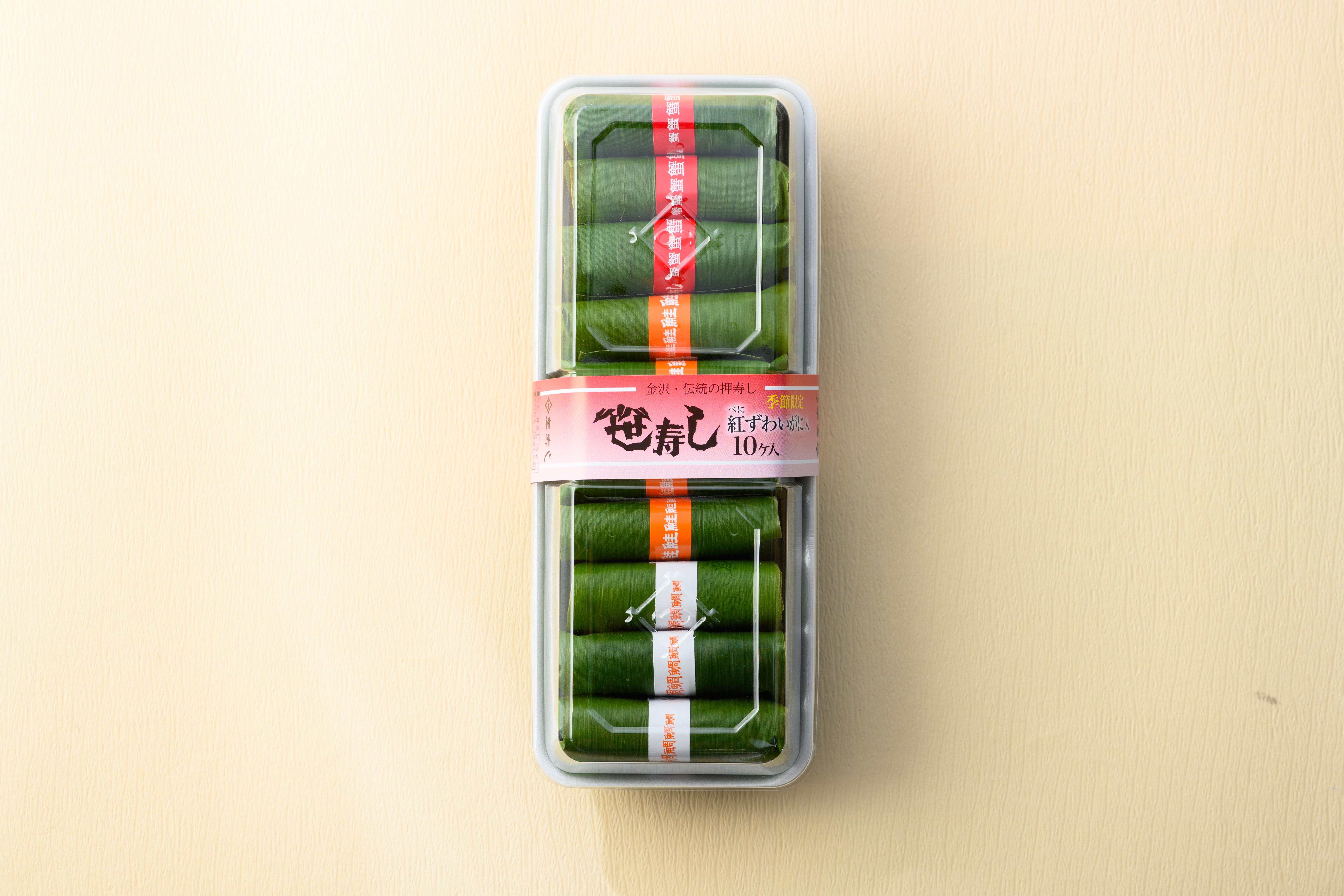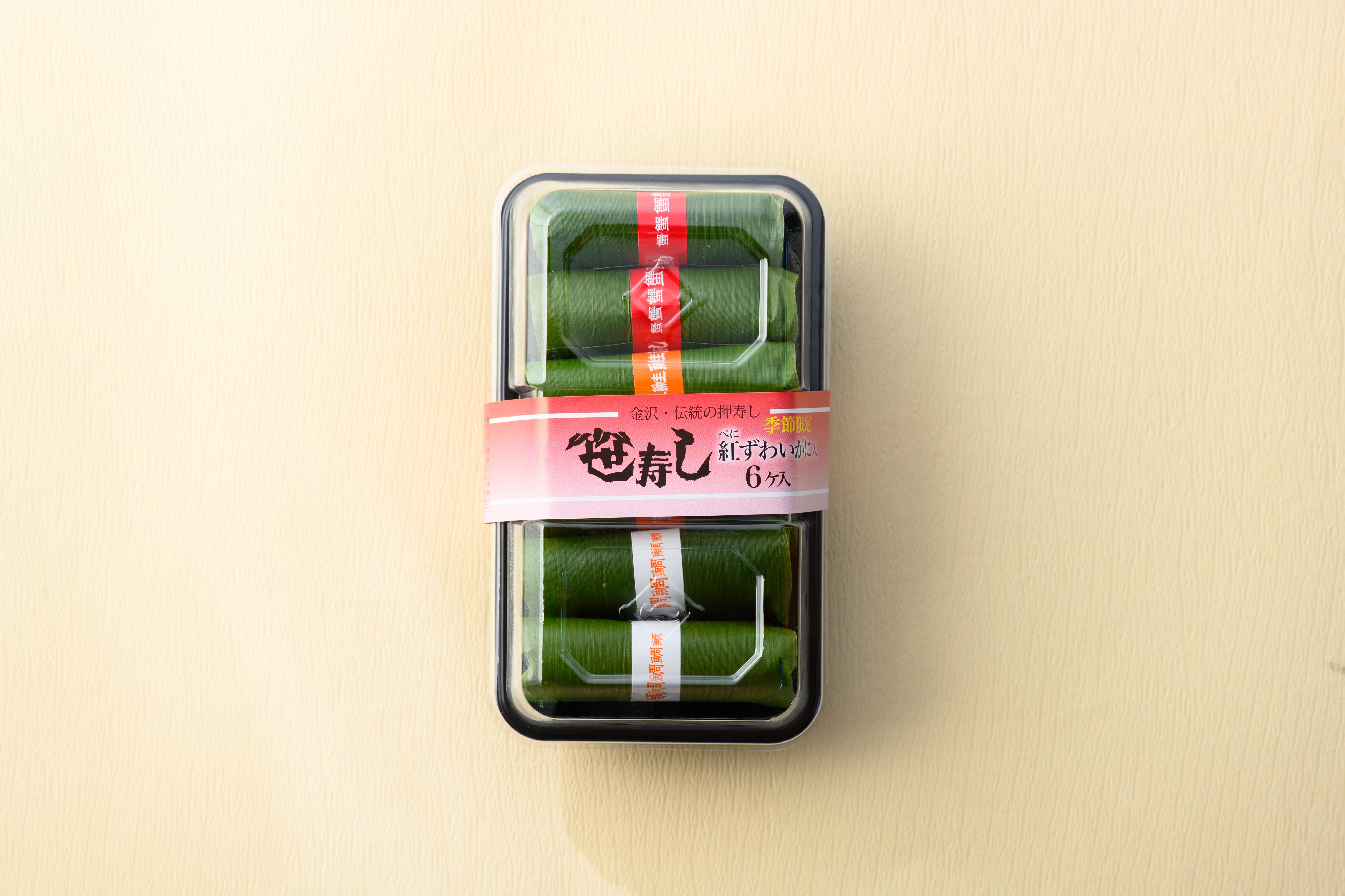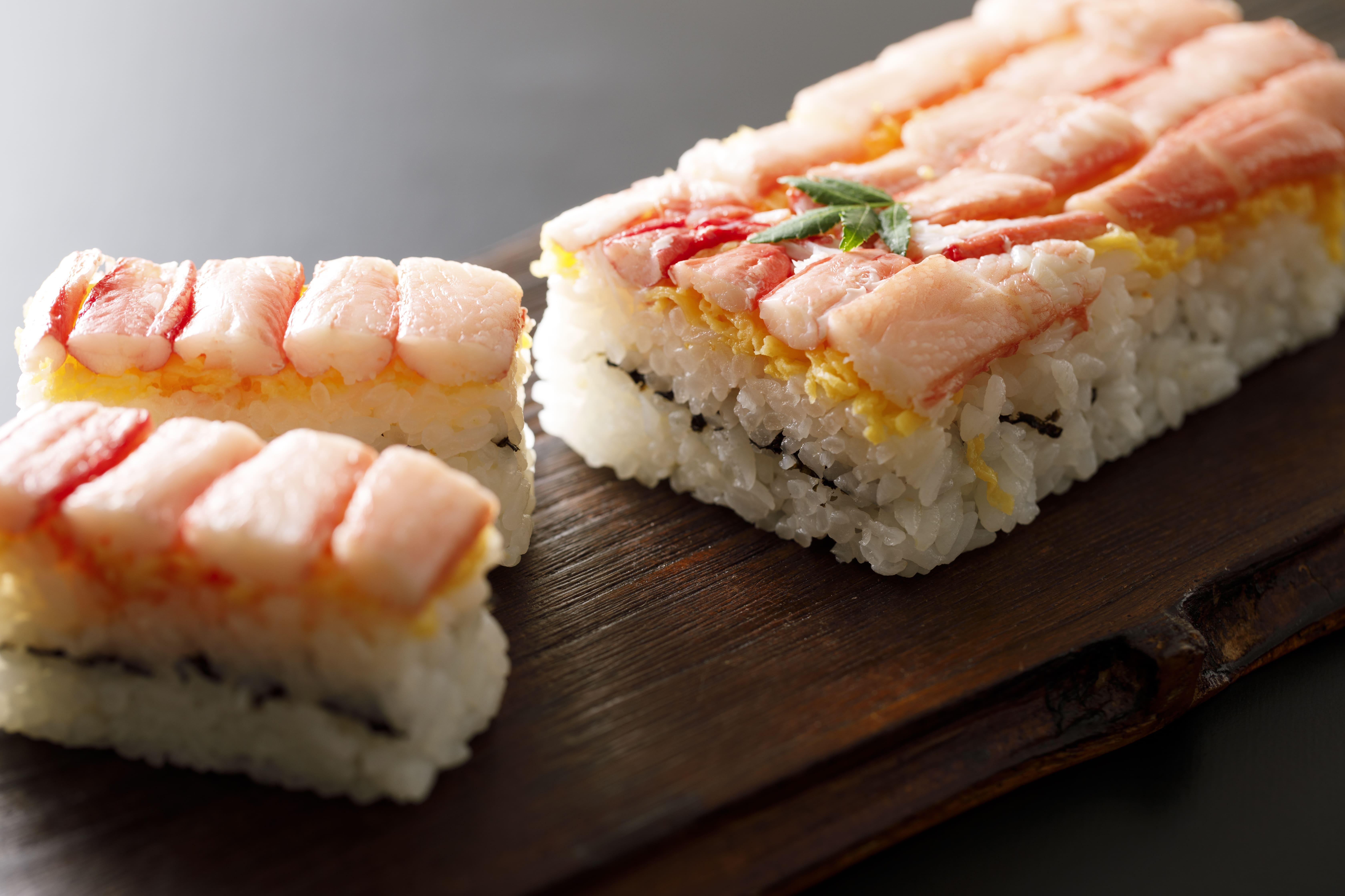 日本海産紅ずわい蟹の中でも、特に大型の蟹の太い棒肉(脚肉)のみを厳選。紅ずわい蟹のみずみずしい甘みを贅沢に楽しめる棒寿しに仕上げました。ポン酢ジュレをかけると、より一層美味しく召し上がれます。