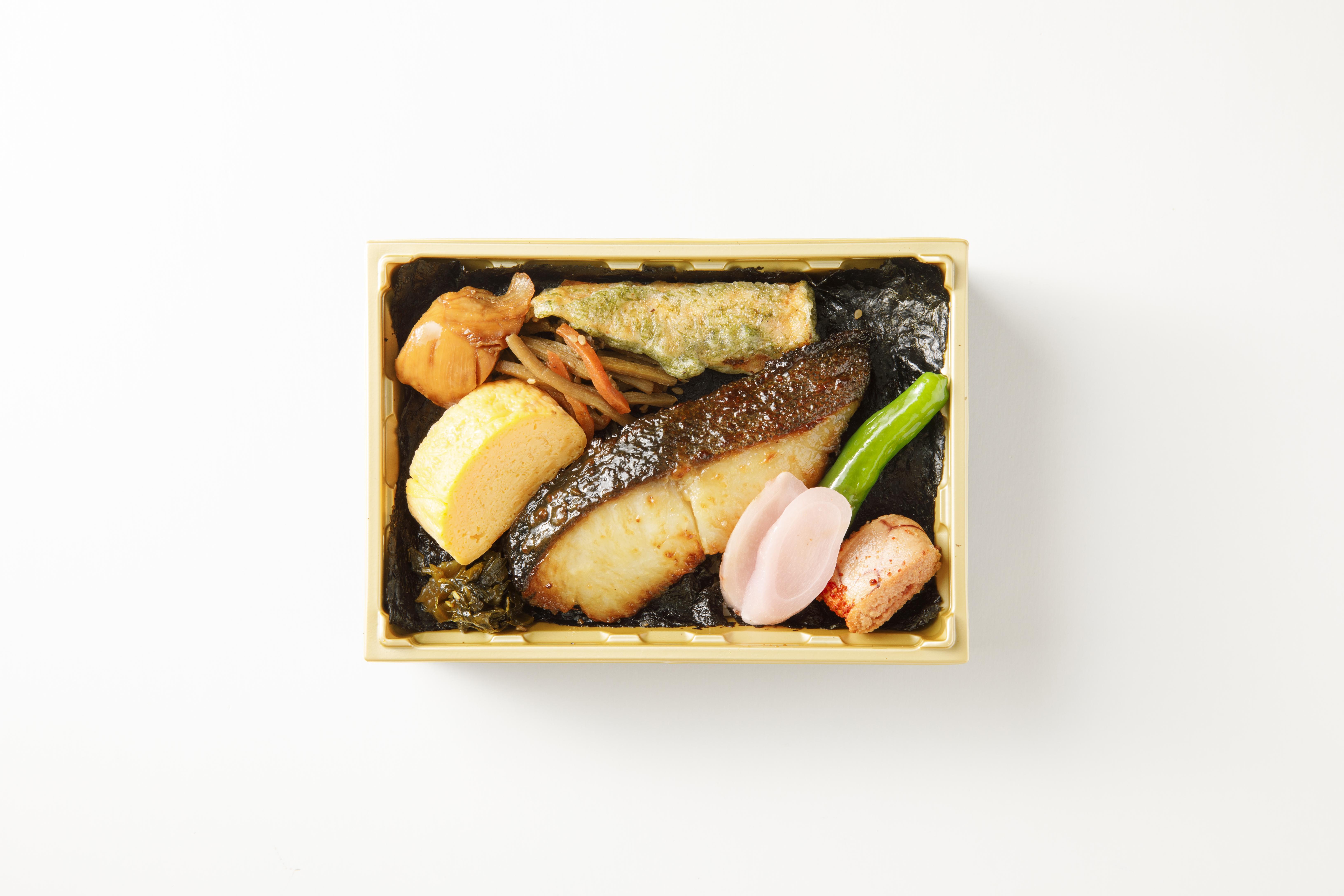 メインのおかずには、絶妙な塩加減で鮭の旨み引き立つ「銀鮭の塩焼き」と、甘みのある脂が口の中でとろける「銀だらの味噌焼き」の二種類をご用意。一口頬張れば、それぞれの素材の味がしっかりと感じられて、どこを食べてもおいしい、芝寿しが”極”め尽くした海苔弁です。