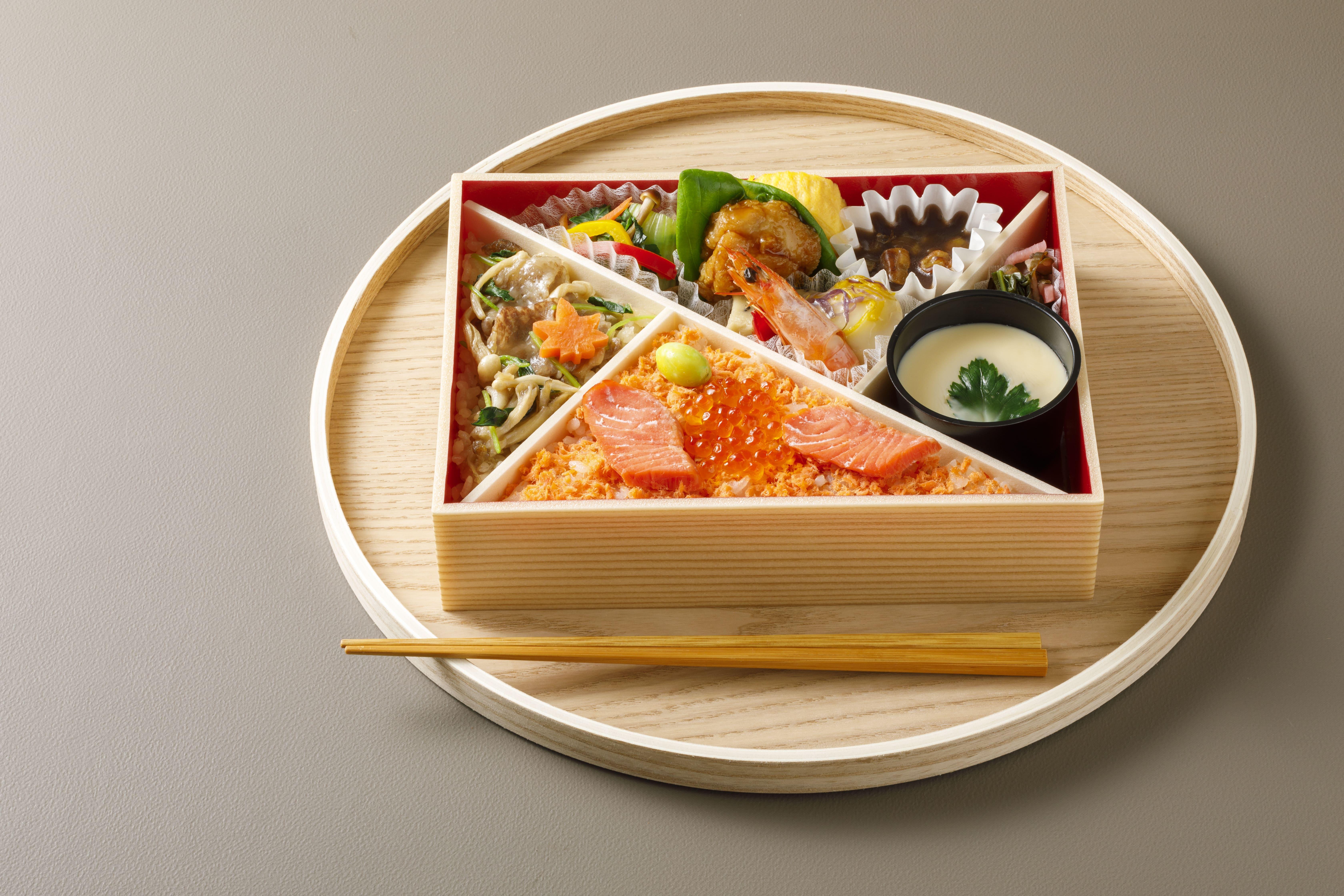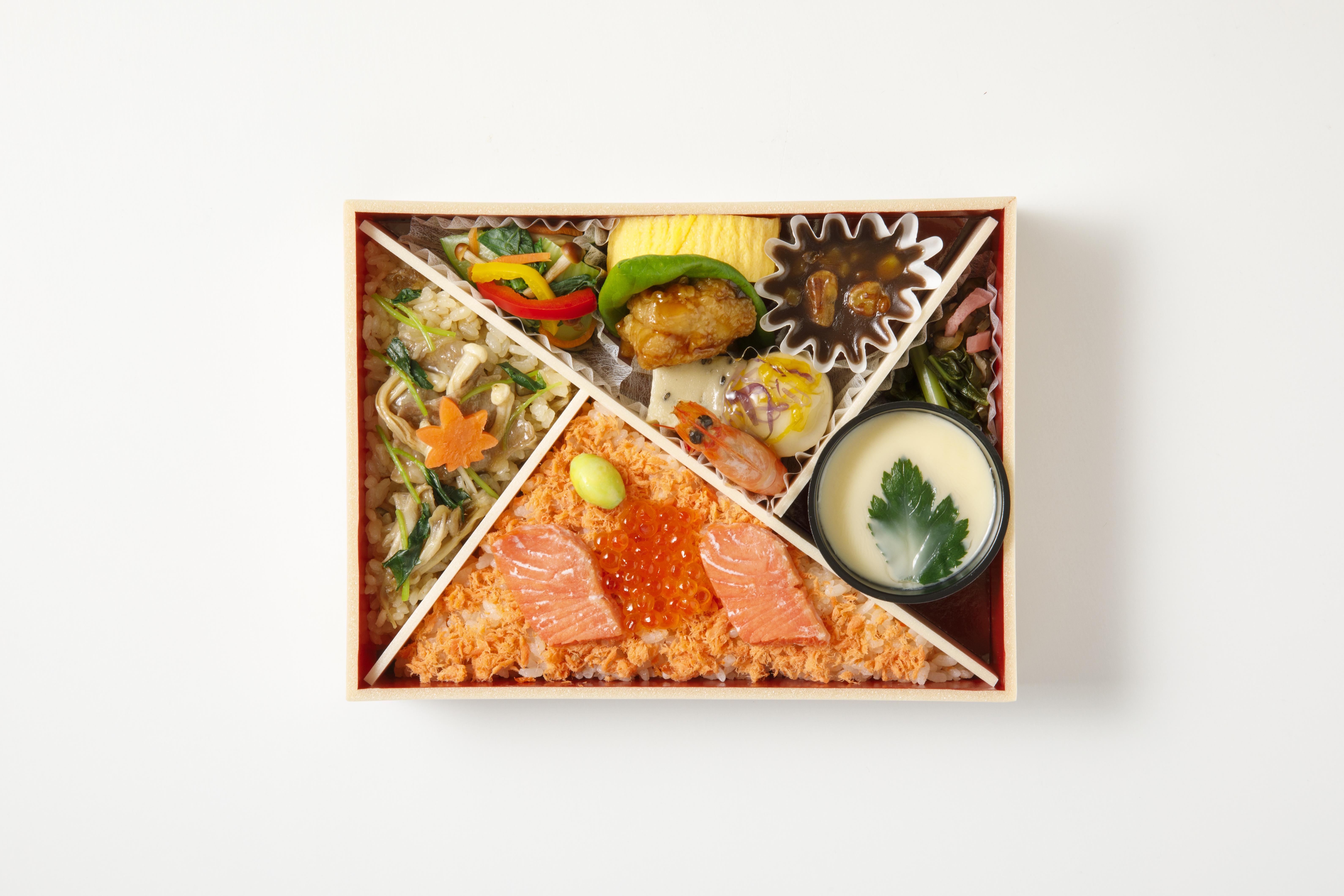 2種類の炊き込み御飯(紅鮭といくら/能登牛ときのこ)をメインに、秋の味覚を贅沢に楽しめるお弁当です。のどごしなめらかな茶碗蒸し入り。