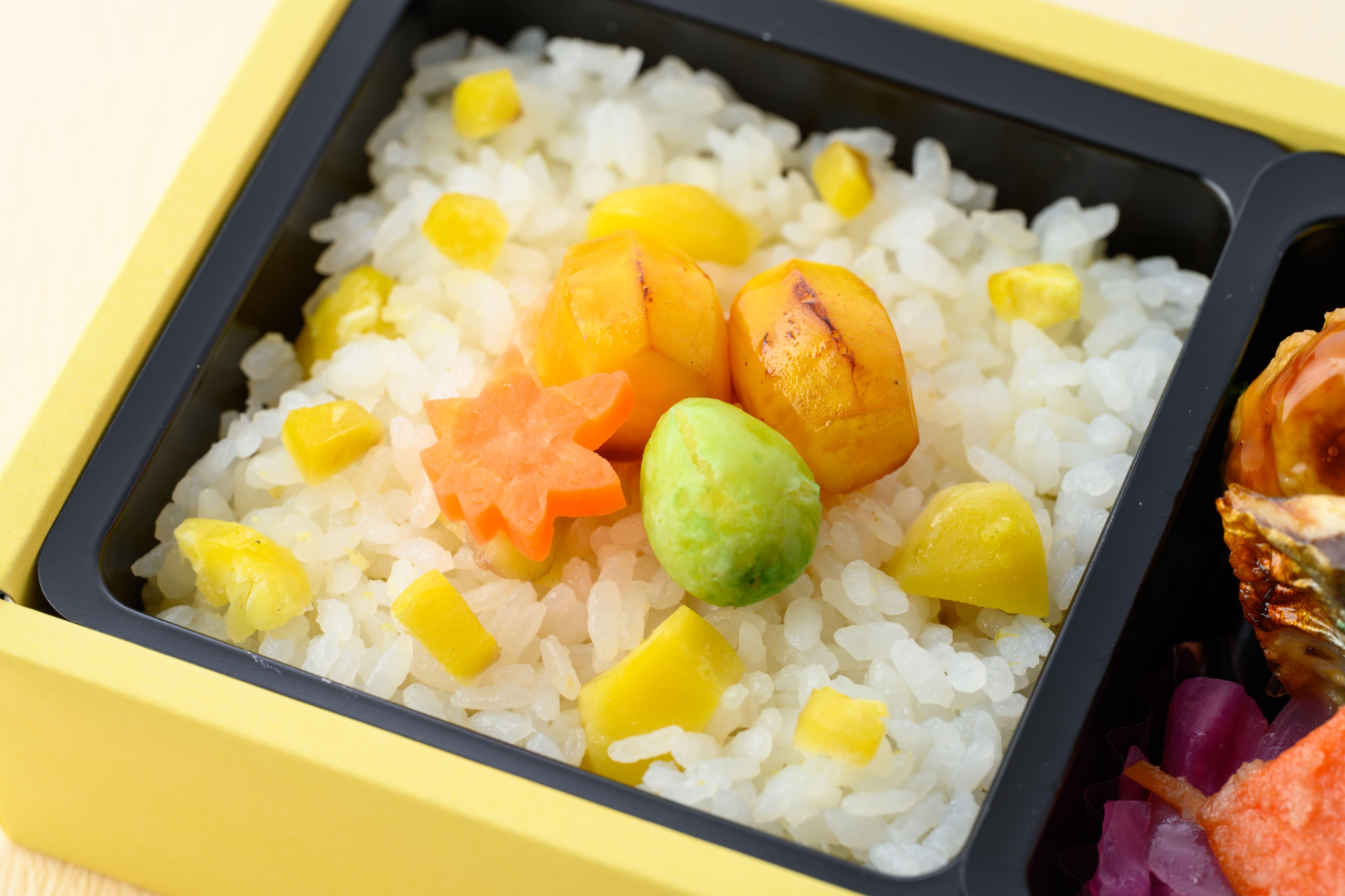 風味豊かな栗の炊き込みごはんに、香ばしい焼き栗、青銀杏、紅葉人参を添え、見た目にも秋の訪れを感じるお弁当です。