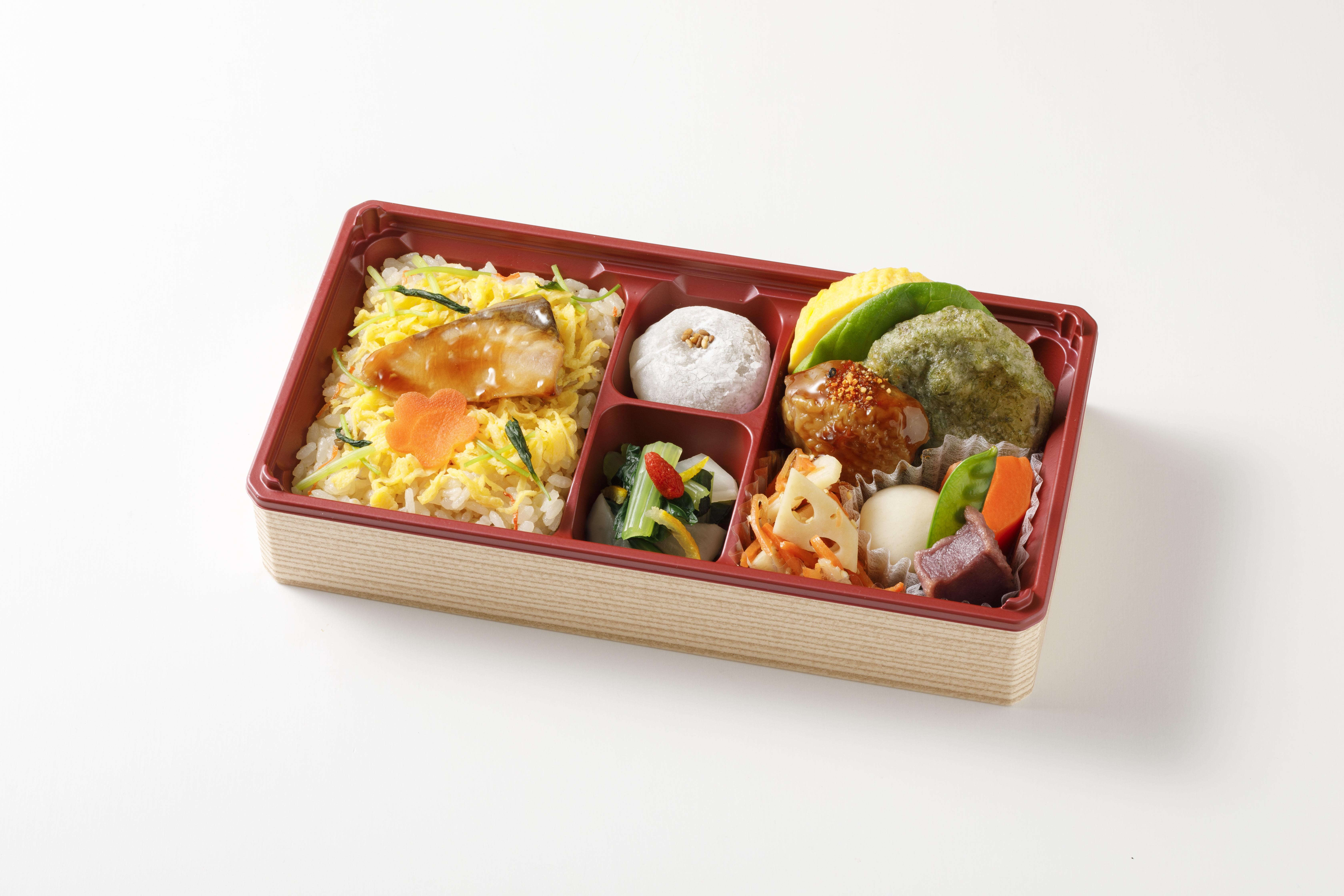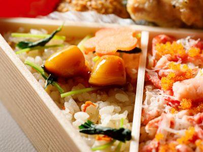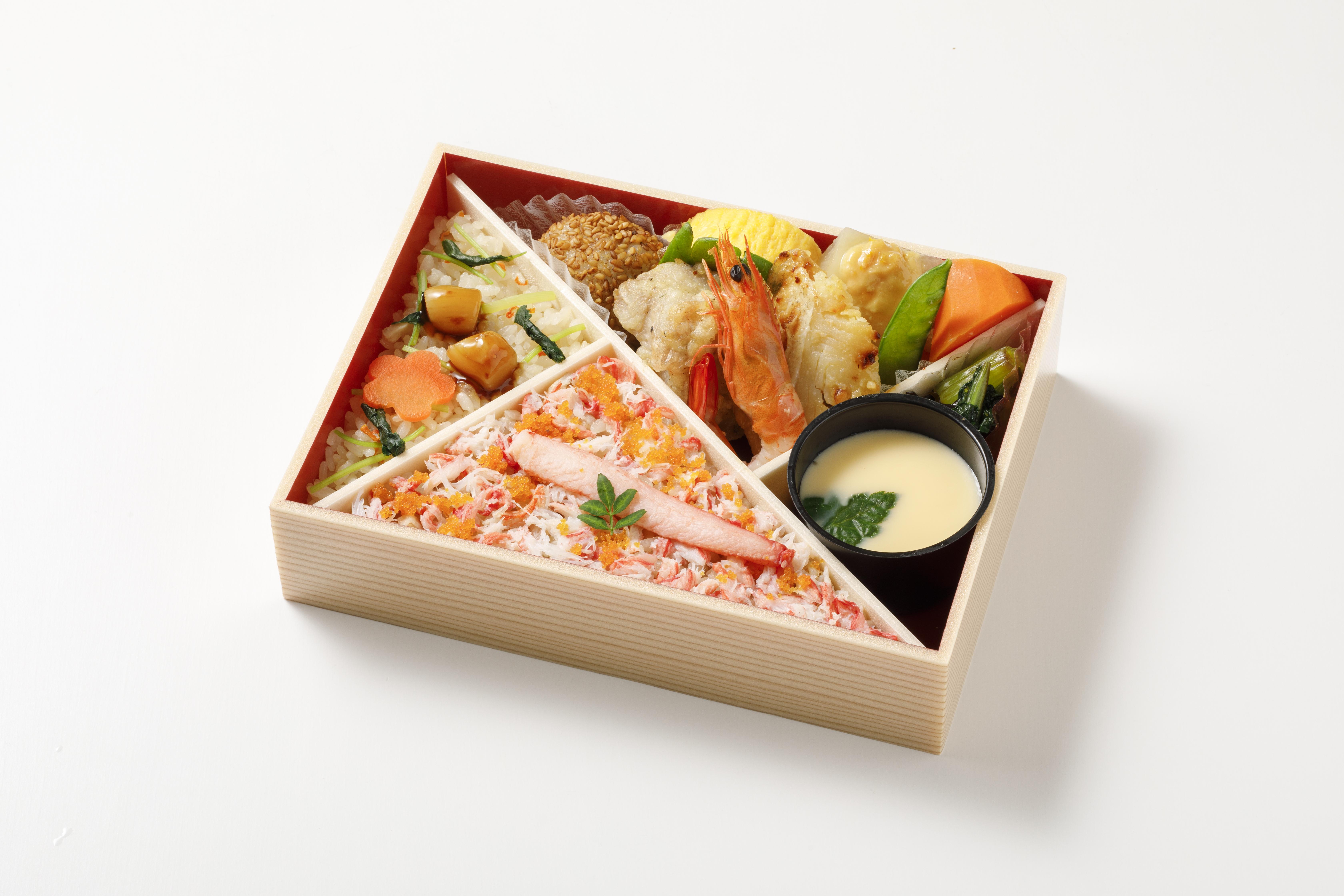 2種類の炊き込みご飯をメインに、冬の味覚を贅沢に楽しめるお弁当です。紅ずわいがにの旨みたっぷりのご飯や大根の柚子味噌かけ、のどごしなめらかな茶碗蒸しなど、上品な味わいに仕上げたお料理を盛り込みました。