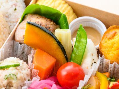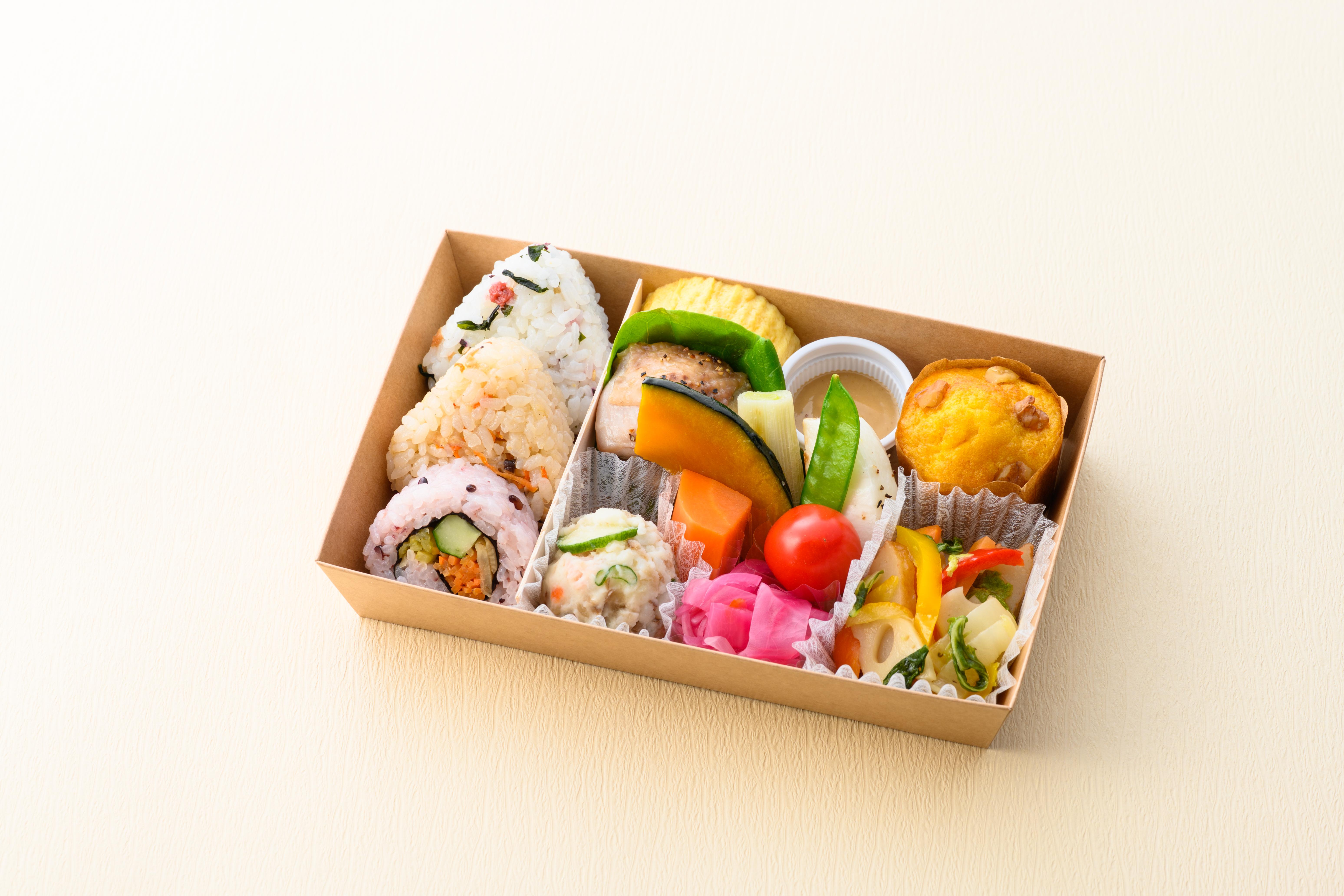 野菜のおいしさがぎゅっと詰まったお弁当です。19種類の野菜を中心に、多彩な食材をバランスよく使用。やさしい甘さのキャロットマフィン付き。